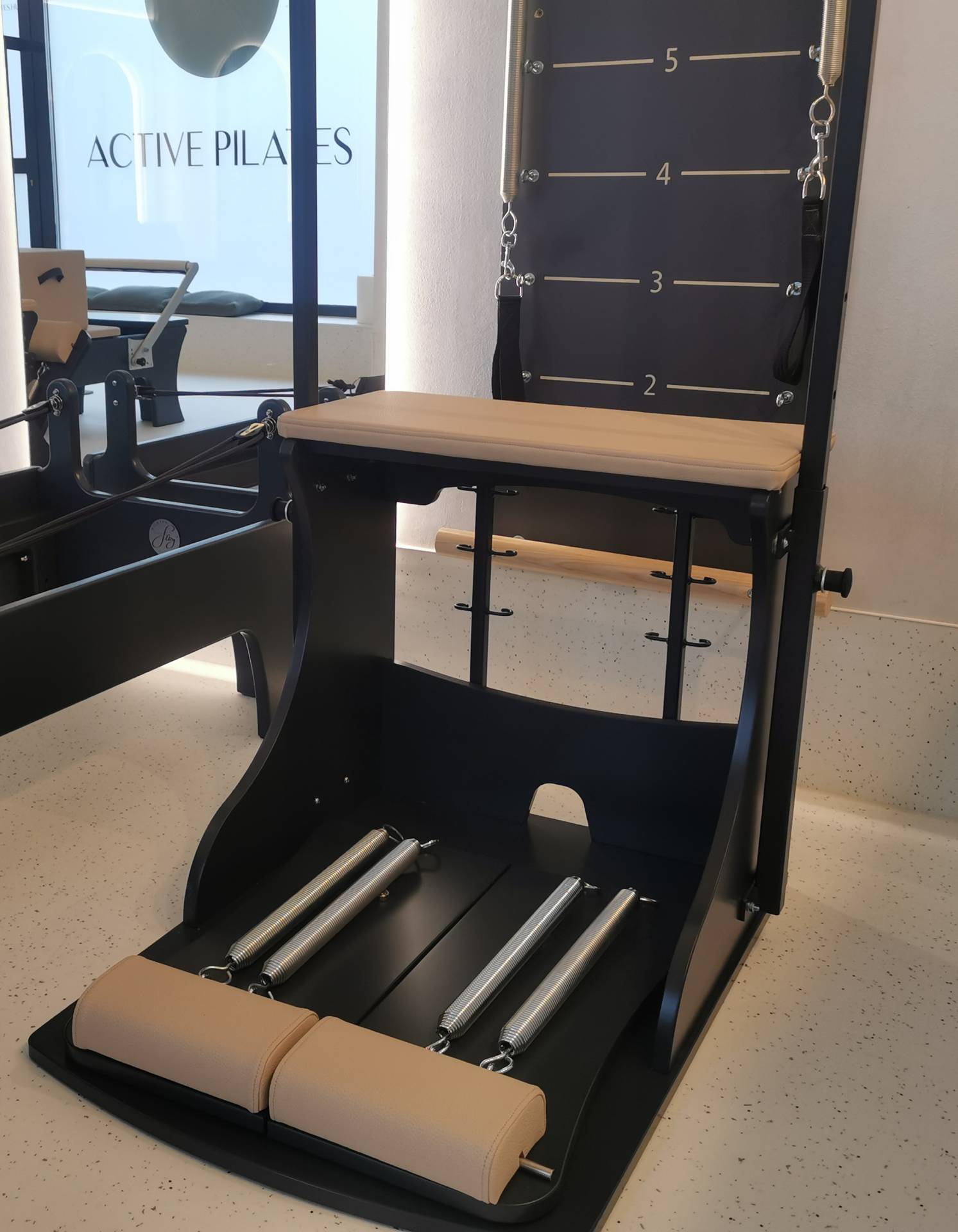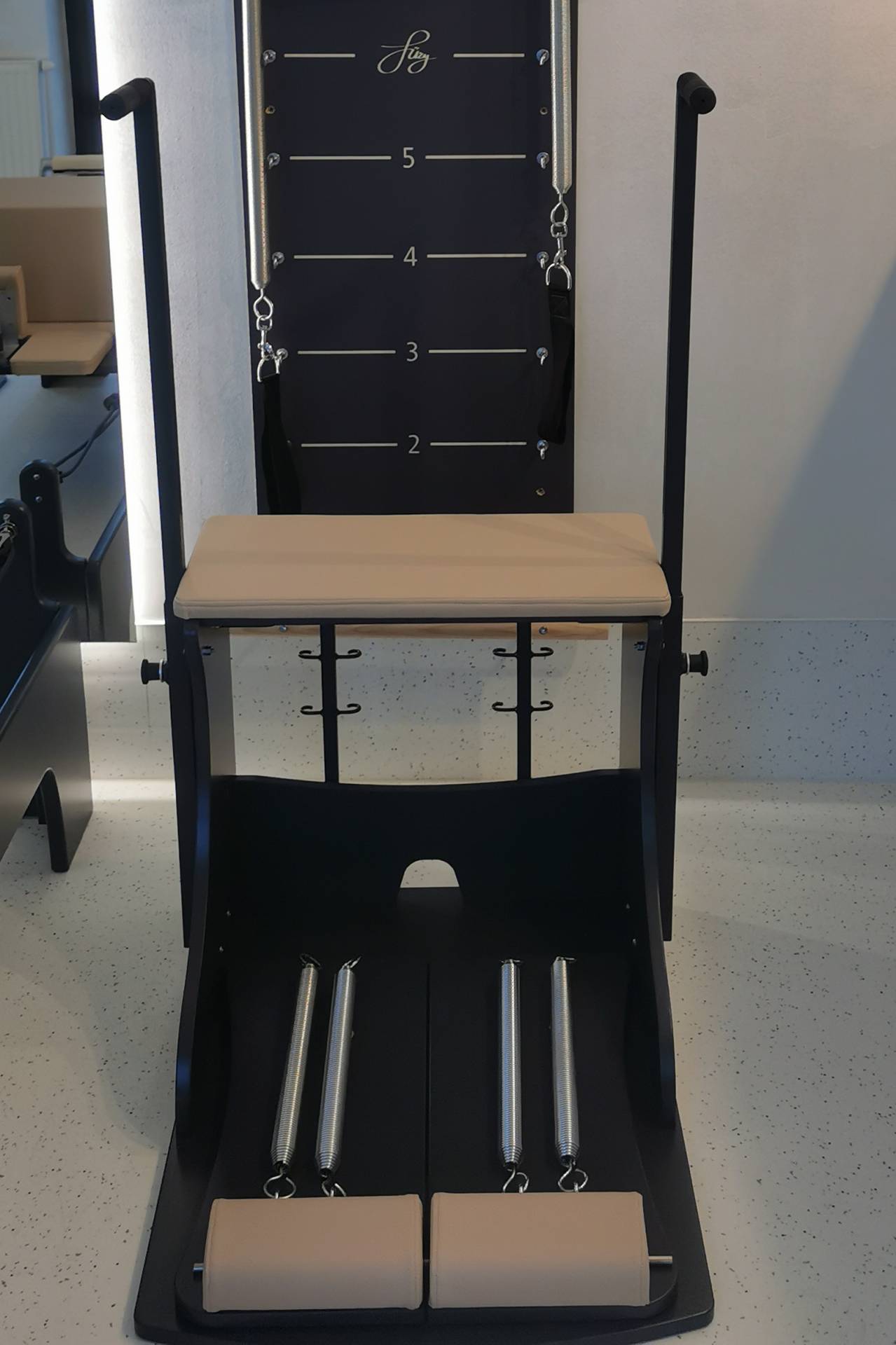Der Combo-Stuhl wurde vom ursprünglichen Wunda-Stuhl von Joseph Pilates inspiriert. Ursprünglich war es als kompaktere Heimgeräte-Alternative für den Reformer konzipiert. Der Combo-Stuhl verfügt über geteilte Pedale – die zusammen oder separat funktionieren können – und bietet eine viel größere Übungsauswahl und eine persönlichere Option. Außerdem können dadurch mehr Rotations- und bilaterale Bewegungen ausgeführt werden. Jedes Pedal verfügt über 2 Federn mit 3-3 Hakenpositionen, insgesamt 81 Stärkevariationen.